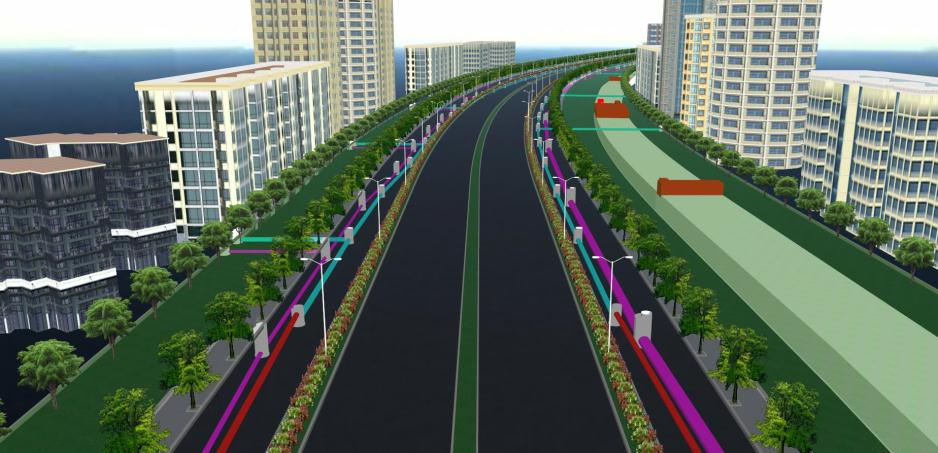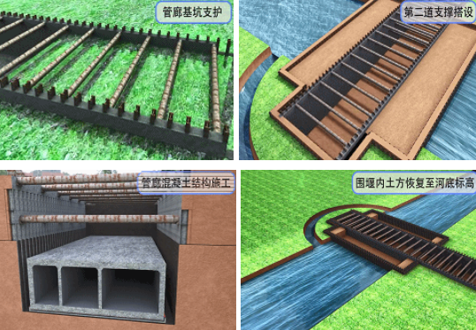 管廊穿越湖泊南引河是本项目的难点,运用BIM技术制作管廊穿河施工方案。