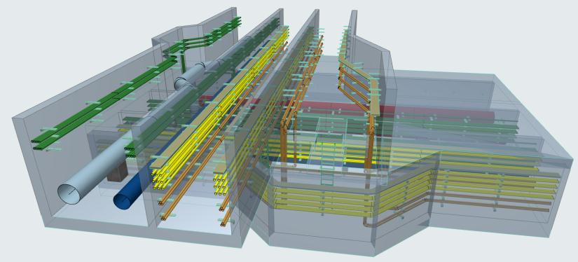 在管廊三维模型建模过程中,发现管道,设备与土建的冲突,在管道综合设计过程中,检测管道碰撞,从而优化设计。