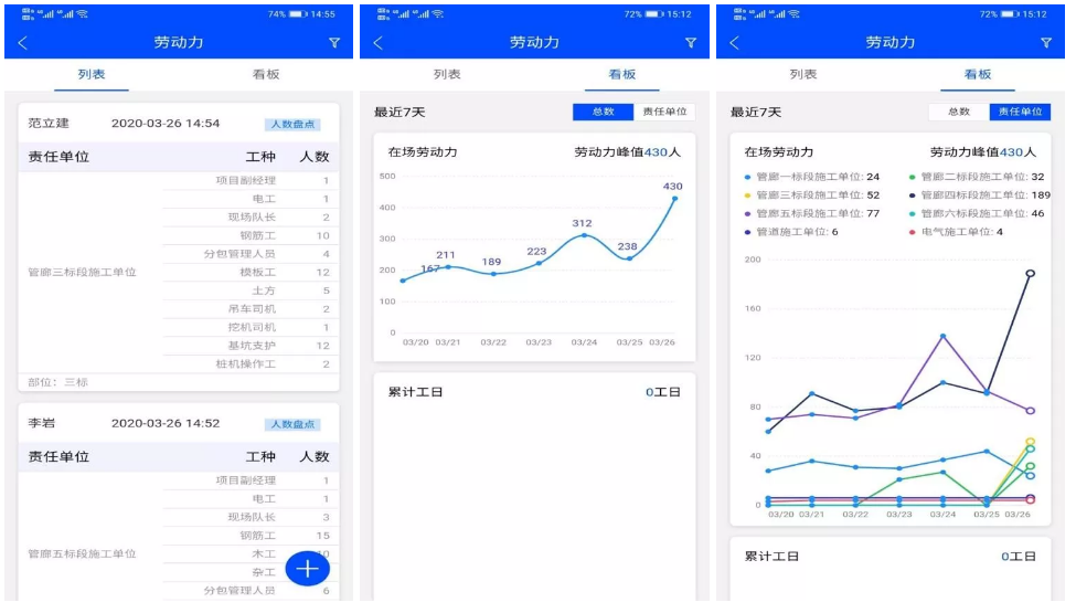 BIM5D手机端录入现场作业人员情况,通过网页端进行实时查看。