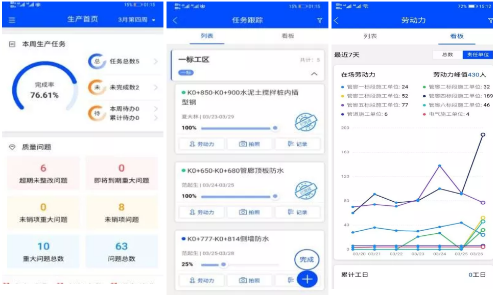 现场管理人员监督各标段周计划,月季划,总进度计划的执行情况,在执行过程中通过手机端反馈执行情况,保证施工进度。