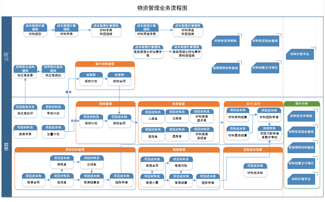 通过项目管理系统的建设实施,完成了九洲建工业务管理流程及业务管理制度的梳理和优化,并制定了配套业务解决方案。完成了投标、收入、劳务分包、专业分包、物资、机械设备、资金、成本等模块的业务流程导航图。