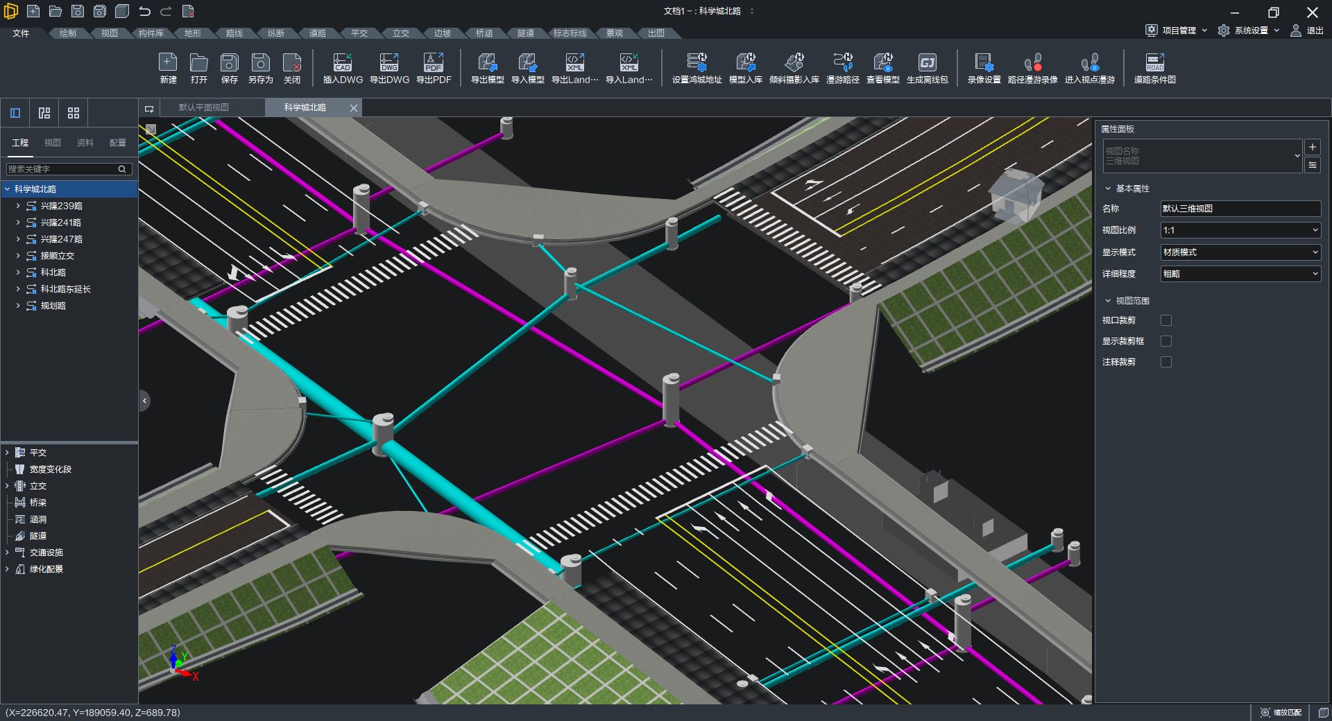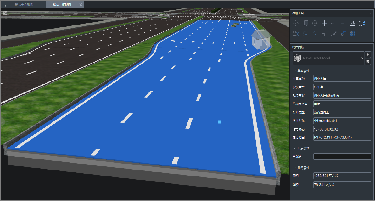道路平面设计及编辑道路设计包括创建道路模型以及平面编辑、布置附属设施等,如超高加宽、路幅过渡、道路出入口、港湾车站、道路护栏;内置常用板块方案且可自定义,各结构层模型拥有独立分类编码;支持列出道路使用的所有板块方案,便于修改或替换方案 |
