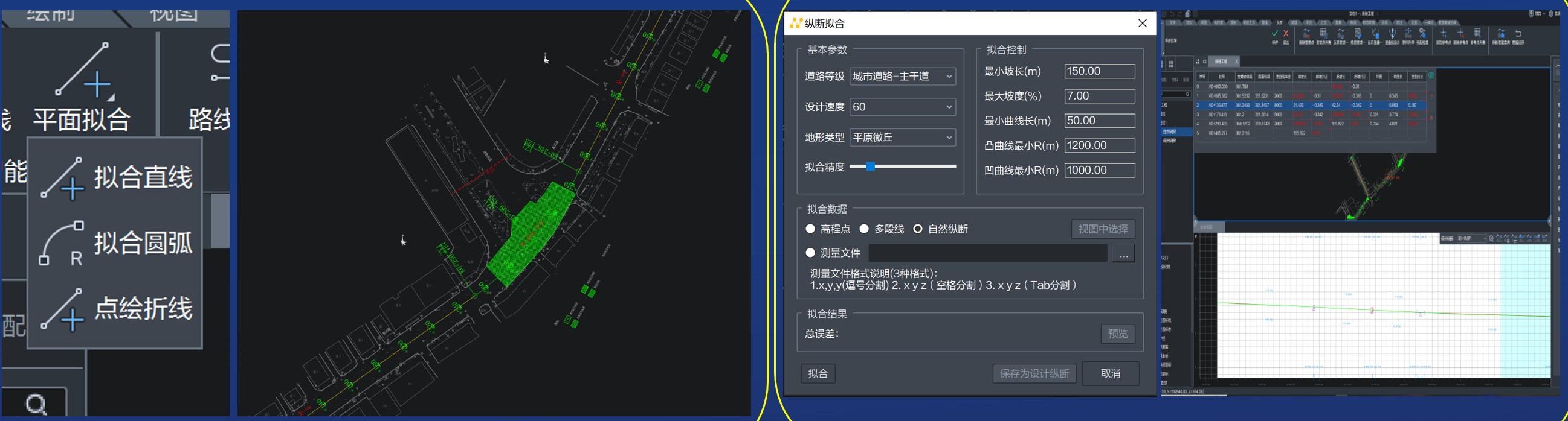 平纵拟合支持旧路改扩建的路线平纵拟合 平面线型拟合功能,能够拟合直线、圆弧及折线,结合接线功能,还原旧路路线走向。 纵段拟合能够结合道路等级和竖向要求等参数,对测量点、多段线和自然线进行竖曲线拟合。 |