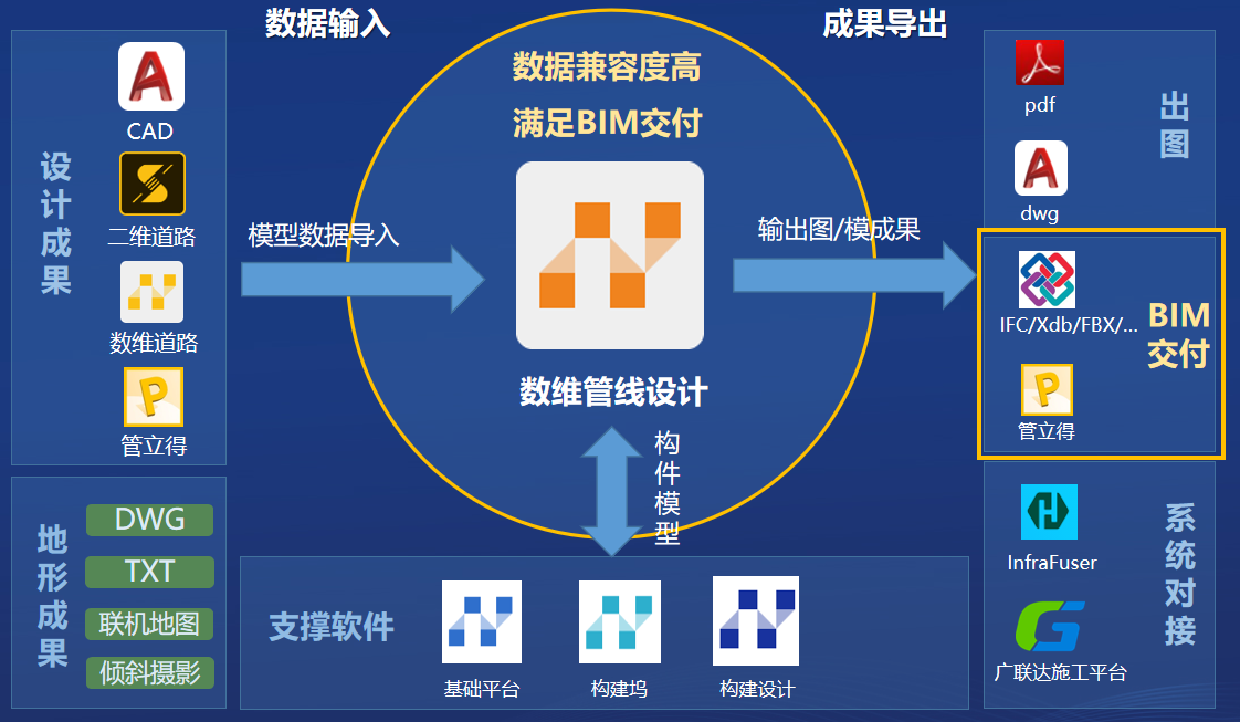 数维管线采用二三维一体的设计机制,可以在熟悉的二维模式下高效设计,同步创建真实的三维模型,真正实现设计、建模只做一遍,并基于模型完成施工图出图。
