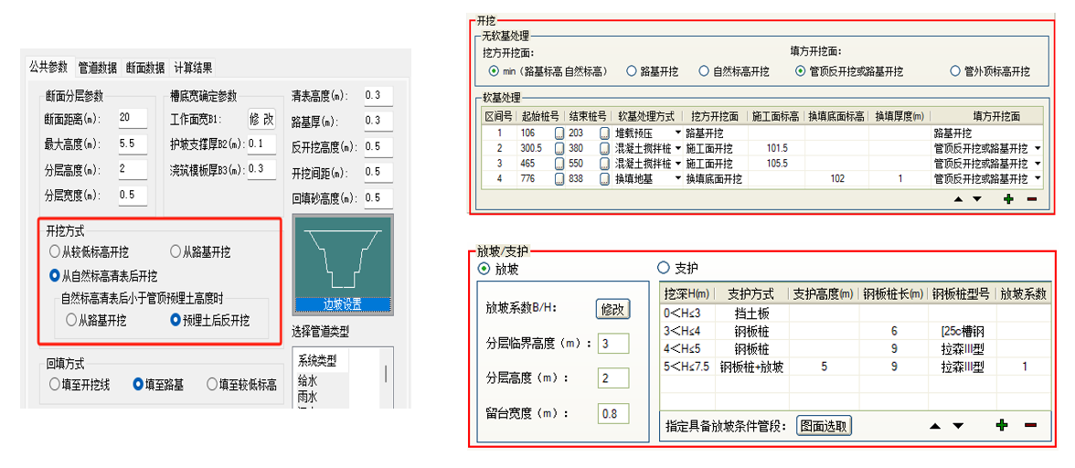 支持软基处理,统计支护工程量。 全新的管道土方计算模块支持软基处理场景。可以预设堆载预压、混凝土搅拌桩、换填地基软基处理范围和开挖面,提升了计算全场景可用性。 新增开挖支护(钢板桩、挡土板)设置,根据设定的挖深区间自动匹配支护方案,并在计算统计中单独统计支护工程量。