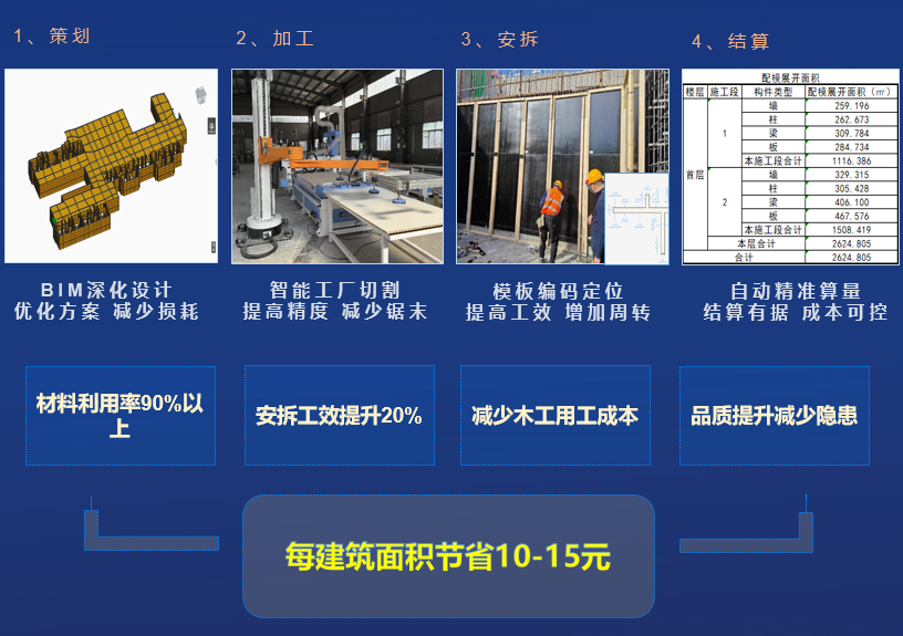 配模设计软件可根据配模、排板结果,快捷准确计算出沾灰面积、配模面积、原材数量以及加工料单,为成本管理、物资管理和结算(对上及对下)管理提供数据抓手。