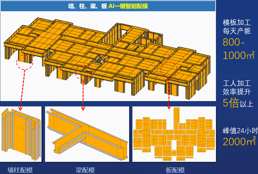 通过读取海量项目的模板方案以及数十个老木工师傅的经验数据,配模时,结合项目施工方案和BIM模型,通过参数设置和算法,即可实现墙、柱、梁、板一键智能配模及复杂工况、异形结构的快速排布配模。