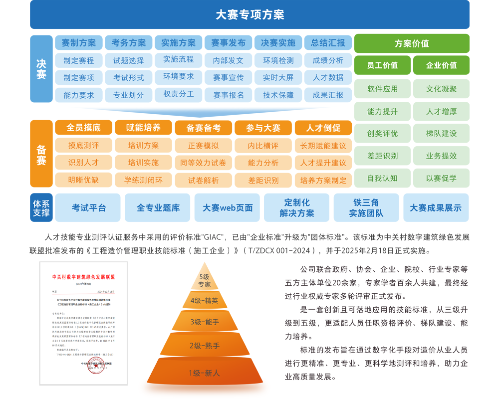 以诚为本赢在诚信9001为客户提供人才技能专业测评认证服务,其中大赛服务旨在为企业提供全过程、全方位、全成长周期的大赛专项方案,帮助企业高效、公正地完成赛事执行,节约人力投入。通过大赛及员工备赛,企业可全面了解员工能力,完善人才档案与梯队建设;通过创奖评优,发掘优秀人才树立标杆,以赛促学,提升团队整体能力,促进企业精细化人才管理,助力降本增效。