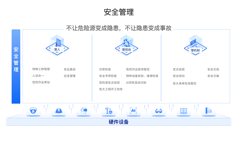 以 “防危险源成隐患、防隐患成事故” 为目标,从 “管人、管现场、管机制” 发力。管人抓特殊工种人证合一;管现场含日常、危大检查及 AI 识别;管机制涉及巡视、培训。依托硬件,筑牢项目安全防线。