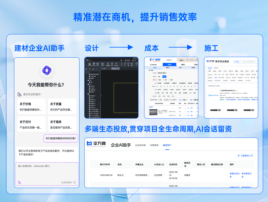 从信息服务到采供撮合业务的重要跨越。深入洞察建材市场,为建材企业精心打造涵盖市场洞察、营销推广、商机撮合等环节的全链路营销解决方案。
