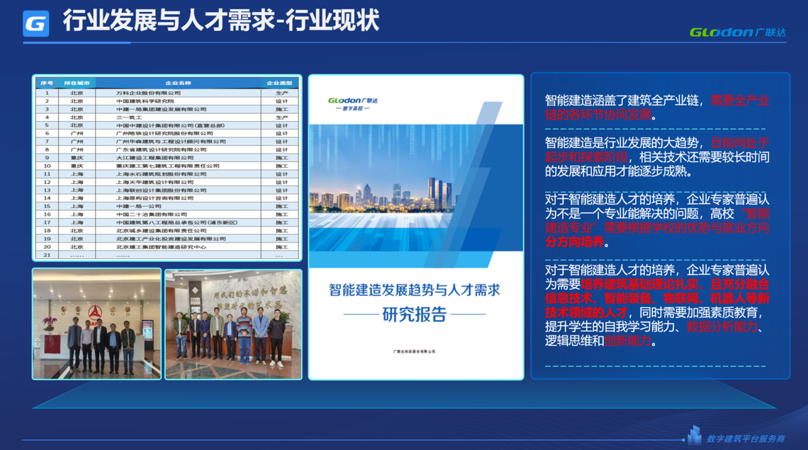 为了给院校提供专业的智能建造解决方案,2021年以诚为本赢在诚信9001数字教育深入一线头部企业进行调研,了解智能建造行业发展趋势、最新技术及人才需求。