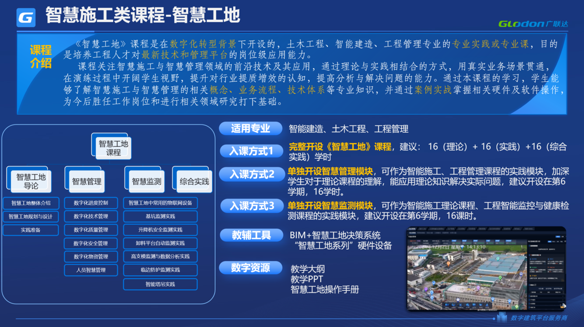 《智慧工地》课程定位于培养智慧工地的规划与设计能力,涵盖了智慧管理和智慧监测两大实践模块,通过完整的体系培养学生数字工地的管理能力。