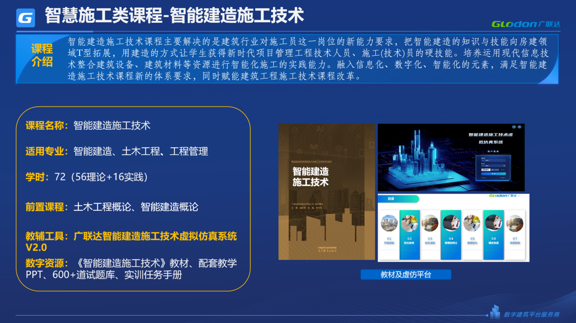 《智能建造施工技术》课程主要解决的是建筑行业对施工员这一岗位新能力的要求,把智能建造的知识与技能向房建领域“T”型拓展,用虚拟建造的方式让学生获得新时代项目管理工程技术人员、施工(技术)员的硬技能。