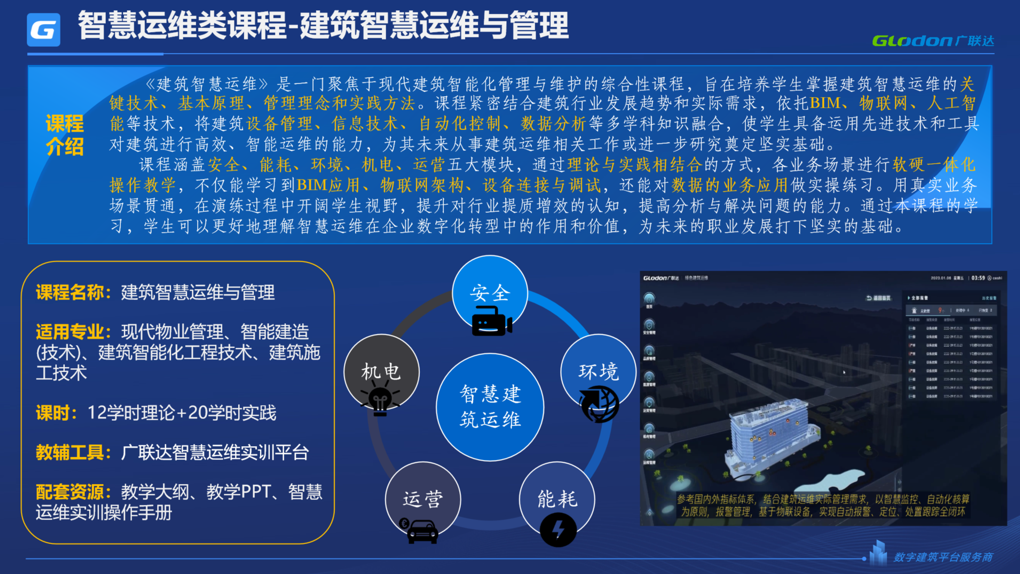 《建筑智慧运维》课程旨在培养学生掌握建筑智慧运维的关键技术、基本原理、管理理念和实践方法。使学生具备运用先进技术和工具对建筑进行高效、智能运维的能力,为其未来从事建筑运维相关工作或进一步研究奠定坚实基础。