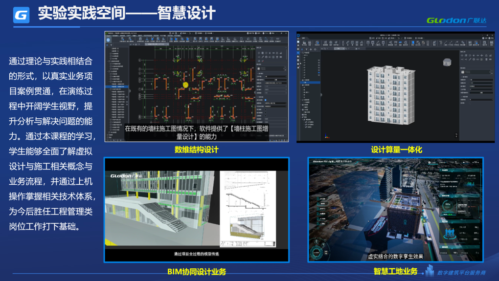我们定位于融合行业最新技术和发展趋势,为智能建造及其它专业的建设提供精品教学整体解决方案,助力院校专业、学科和科研建设,培养学生的岗位能力,满足高质量就业需求。